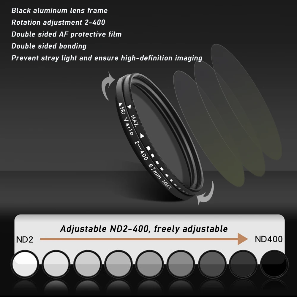 67mm Variable ND Filter ND2-400 Adjustable Lens with Universal Clip for Landscape/Concerts/Laser/Night Photography, Aluminum Frame Glass Waterproof Anti-Fog for DSLR/Smartphones
