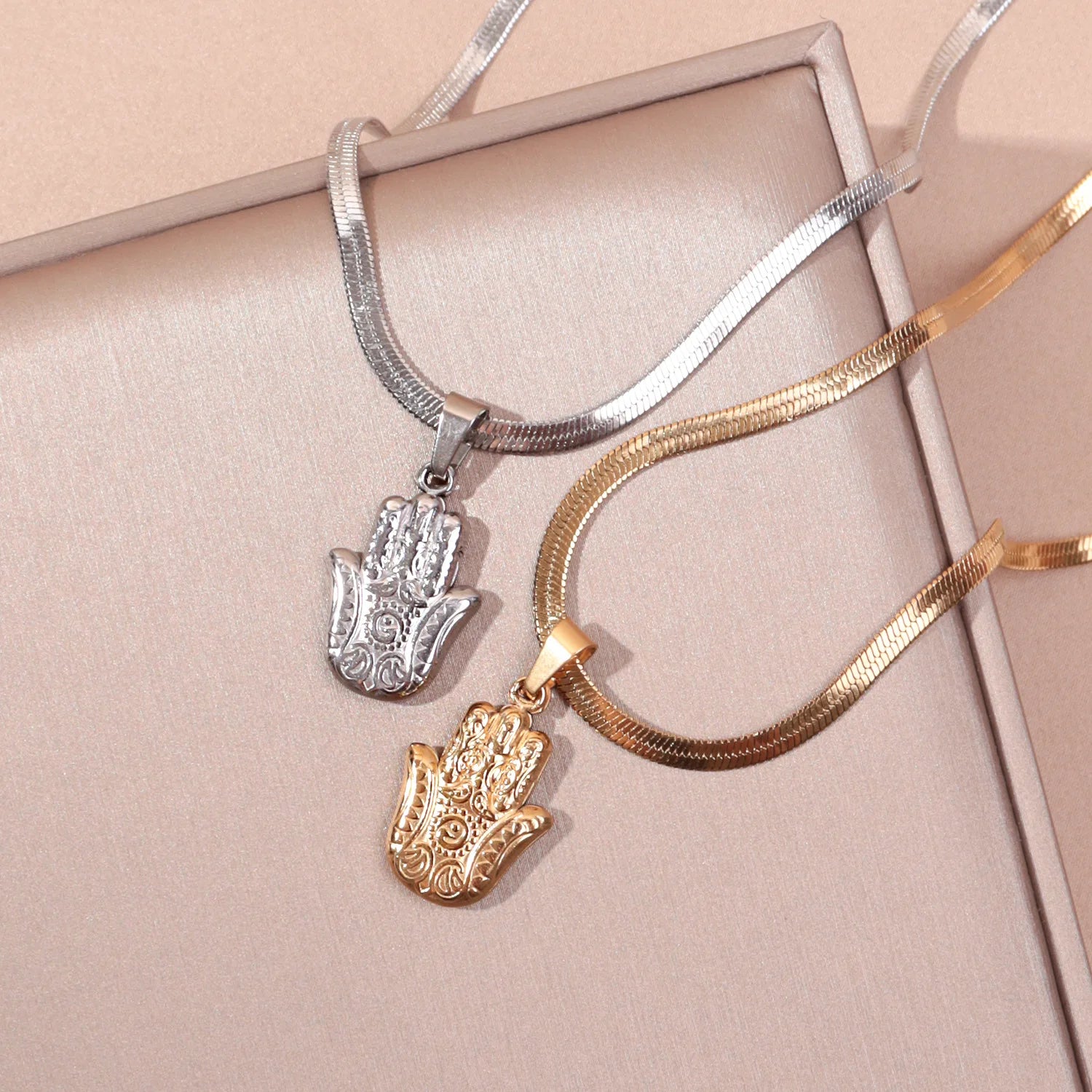 Hamsa Hand Pendant Necklace Women Men Amulet Stainless Steel Herringbone Snake Chain Hand of Fatima Choker Islamic Jewelry