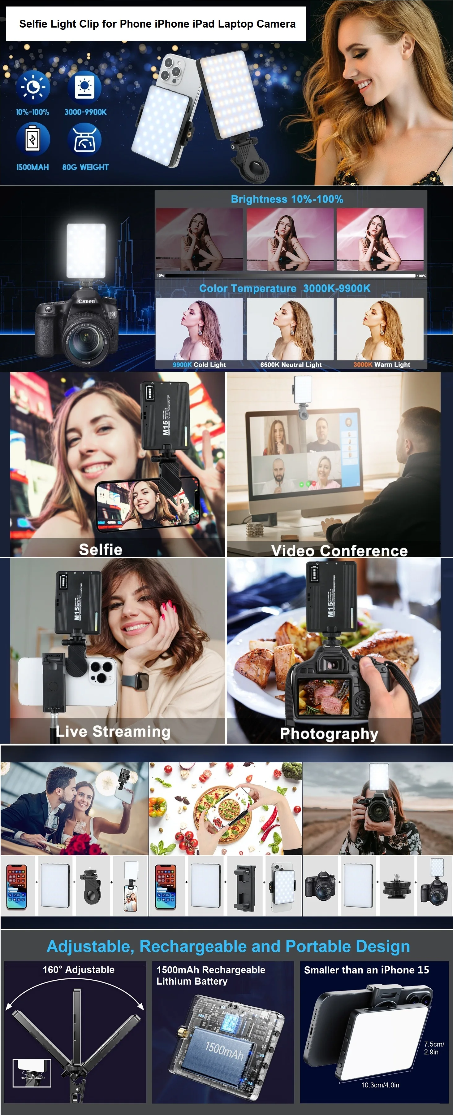 【Universal Compatibility】Our M15 LED selfie light is compatible with all smartphones, tablets, laptops, cameras and tripods. It is perfect for creating high-quality real-time videos on popular social media platforms such as Facebook, YouTube, Twitter, Snapchat, TikTok, etc. It is used for selfies, makeup, live show, art photography, live streaming and other scenes to solve the problem of low light. It is only pocket-sized for easy to carry it with you wherever you go.