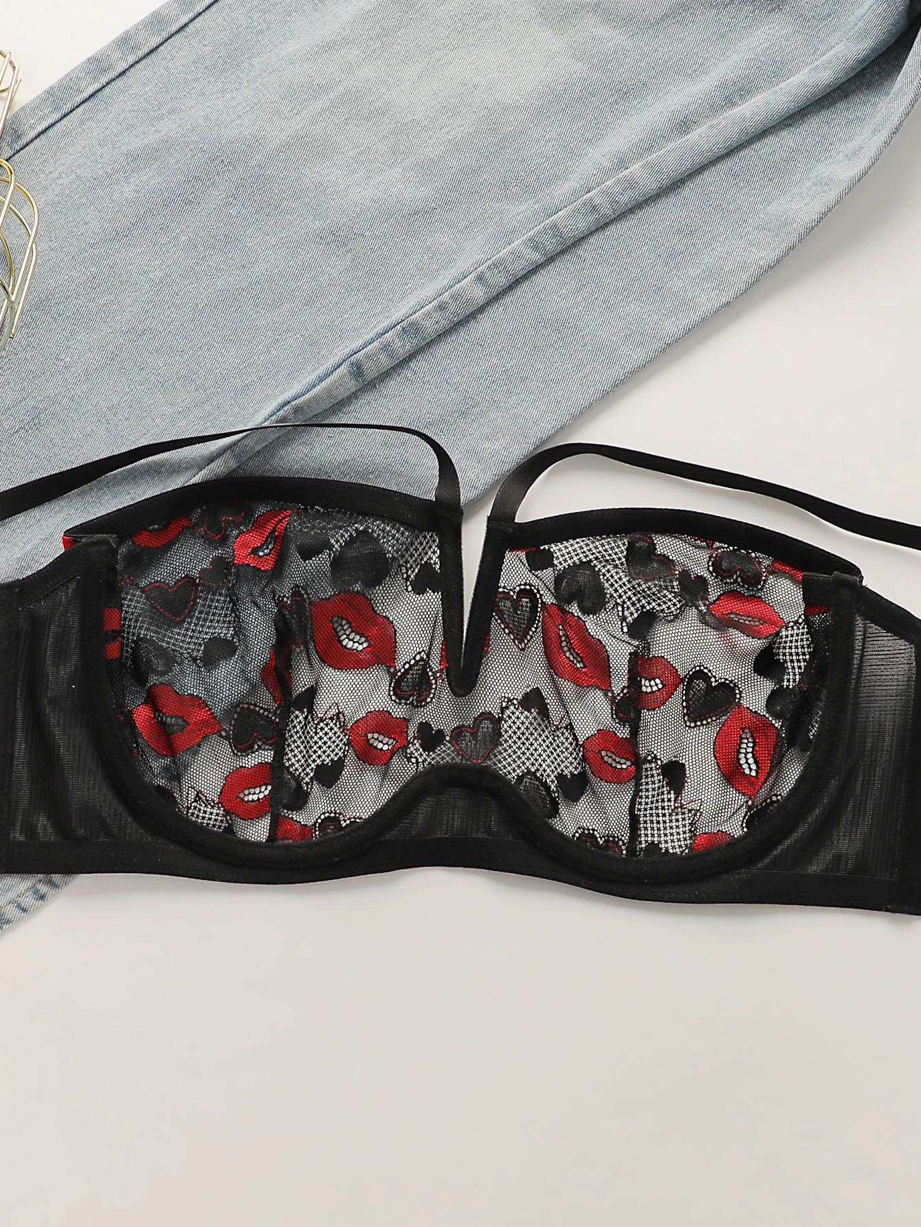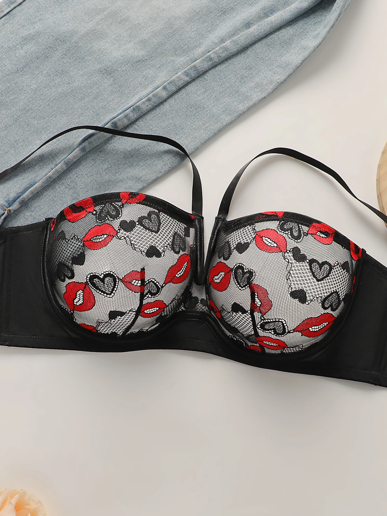 Women's hanging neck red lips heart-shaped lace plus size deep V sexy bra with steel rims gathered push up bra MR3063